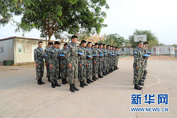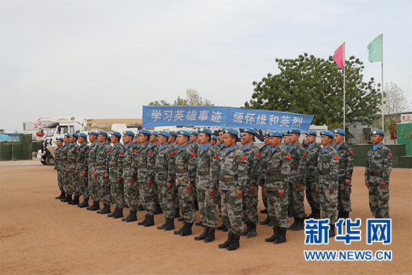 祭奠儀式上,大型機(jī)械鳴笛三聲,哀思樂曲響起,全體官兵整裝列隊(duì),集體脫帽為犧牲在維和戰(zhàn)場(chǎng)上的英烈默哀三分鐘。隨后,官兵代表致辭,追憶維和英烈們無私奉獻(xiàn)、舍生取義的光輝事跡,表達(dá)為達(dá)爾富爾地區(qū)和平建設(shè)而努力奮斗的堅(jiān)定決心。