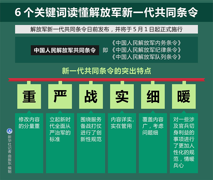新華社北京4月15日電(記者黎云、劉濟(jì)美)解放軍新一代共同條令日前發(fā)布,并將于5月1日起正式施行。記者從中央軍委訓(xùn)練管理部采訪獲悉,“重、嚴(yán)、戰(zhàn)、實(shí)、細(xì)、暖”6個(gè)關(guān)鍵詞,是新一代共同條令的突出特點(diǎn)。