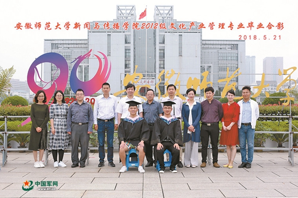 5月21日,安徽師范大學(xué)新聞與傳播學(xué)院組織應(yīng)屆畢業(yè)生拍攝畢業(yè)照,眾多班級(jí)的學(xué)生依次排隊(duì)拍攝,其中一個(gè)班級(jí)與眾不同——只有兩名學(xué)生,而與他倆合影的卻有11名老師。并且,11名老師站在后排,兩名學(xué)生坐在前排。當(dāng)相機(jī)的快門(mén)摁下之后,這張照片成為該校濃厚尊崇軍人氛圍的亮麗名片。