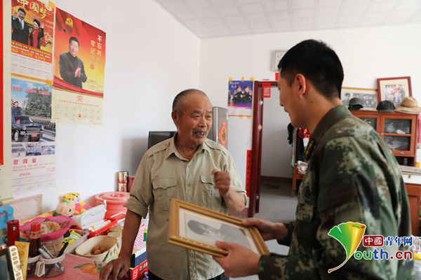 ????孟曉暉的爺爺孟慶欣也曾經(jīng)是一名解放軍戰(zhàn)士,并榮獲過獨立獎?wù)?。每?dāng)說起自己的從軍經(jīng)歷時,這位年過八旬的老人都十分振奮,談到繼承了“紅色基因”的兒孫時,孟慶欣老人的驕傲與自豪更是溢于言表。他說,自己經(jīng)常把當(dāng)年參軍的故事講給子孫聽,曉暉就是聽著爺爺?shù)墓适麻L大的,從小就說自己長大后也要當(dāng)兵。在唱起這首凝聚了他熱血青春與報國壯志的軍歌之前,老人嚴肅地說道:“我要換上一身整潔的軍裝!”