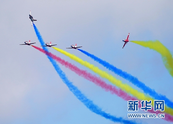 8月30日,“紅鷹”飛行表演隊在空軍航空開放活動上進行飛行表演。新華社記者 王東明攝