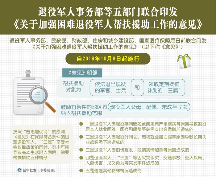 《意見》以習近平新時代中國特色社會主義思想為指導,貫徹落實以人民為中心的發(fā)展思想,充分考慮退役軍人為國防和軍隊建設所作貢獻,借鑒國內外有益做法,聚焦退役軍人特點訴求,結合管理服務現(xiàn)實需要,對幫扶援助的對象情形、方式方法、保障標準、辦理程序等事項作出規(guī)范和明確,對于推動建立困難退役軍人幫扶援助新機制,進一步提高救急濟難水平,服務軍地改革發(fā)展、促進社會和諧穩(wěn)定、體現(xiàn)社會尊崇優(yōu)待具有重要意義。