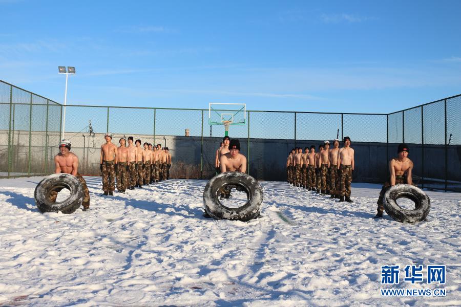 武警黑龍江總隊(duì)黑河支隊(duì)官兵冒著零下20攝氏度嚴(yán)寒在雪中開(kāi)展翻輪胎訓(xùn)練(12月10日攝)。新華社發(fā)(李響 攝)