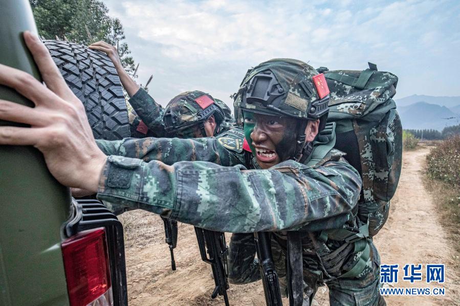 武警廣西總隊(duì)貴港支隊(duì)官兵在野外進(jìn)行坡地推車(chē)訓(xùn)練(12月14日攝)。新華社發(fā)(余海洋 攝)