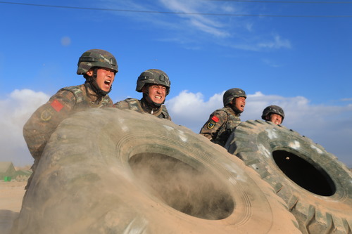 ????武警新疆總隊(duì)某機(jī)動支隊(duì)特戰(zhàn)一中隊(duì)組織官兵進(jìn)行翻輪胎體能訓(xùn)練(10月30日攝)。新華社發(fā)(張文 攝)