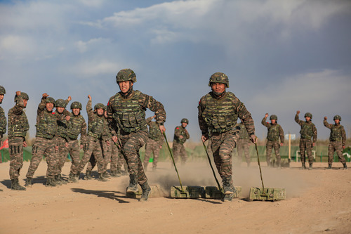 ????武警新疆總隊(duì)某機(jī)動支隊(duì)特戰(zhàn)一中隊(duì)組織官兵進(jìn)行搬運(yùn)子彈箱體能訓(xùn)練(10月30日攝)。新華社發(fā)(張文 攝)