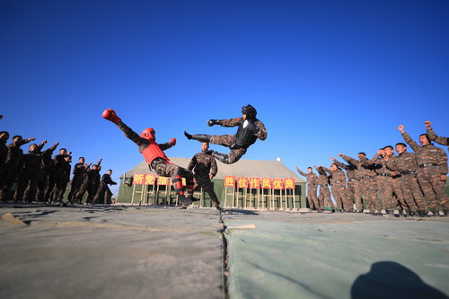 ????武警新疆總隊(duì)某機(jī)動支隊(duì)特戰(zhàn)一中隊(duì)組織官兵開展搏擊訓(xùn)練(10月31日攝)。新華社發(fā)(張文 攝)