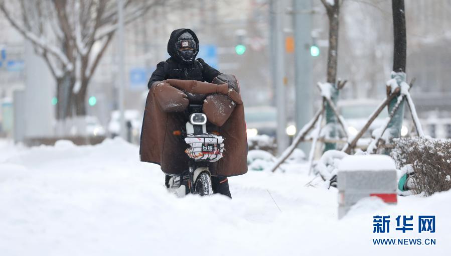 1月28日,在沈陽市渾南區(qū),市民在積雪中騎行。