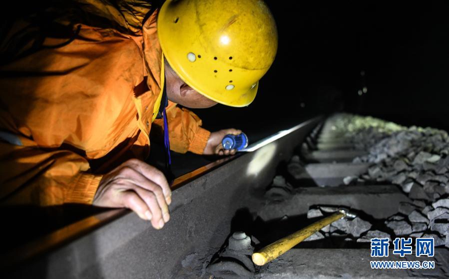 在廣西河池境內(nèi)黔桂鐵路線上的鄧山隧道,中國鐵路南寧局集團(tuán)有限公司柳州工務(wù)段的4名看守工輪換值班,依靠手電筒在黑暗中穿行,及時巡查隧道中可能出現(xiàn)的各種隱患,確保每天經(jīng)隧道運行的59趟客貨列車春運安全。鄧山隧道全長773米,是一個需要人員全天候看守的鐵路隧道。