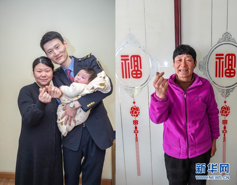 拼版照片:左圖為2月10日,在重慶市渝中區(qū)的家中,付寶印抱著兒子和妻子孫夢(mèng)潔比出心形手勢(shì)(新華社記者 黃偉 攝);右圖為2月9日,付寶印的母親鐘士輝在吉林省長(zhǎng)春市農(nóng)安縣楊樹(shù)林鄉(xiāng)牛尾巴山村家中比出心形手勢(shì)(新華社記者 張楠 攝)。