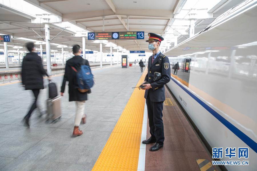 2月9日,付寶印在重慶北站站臺(tái)迎接旅客。新華社記者 黃偉 攝