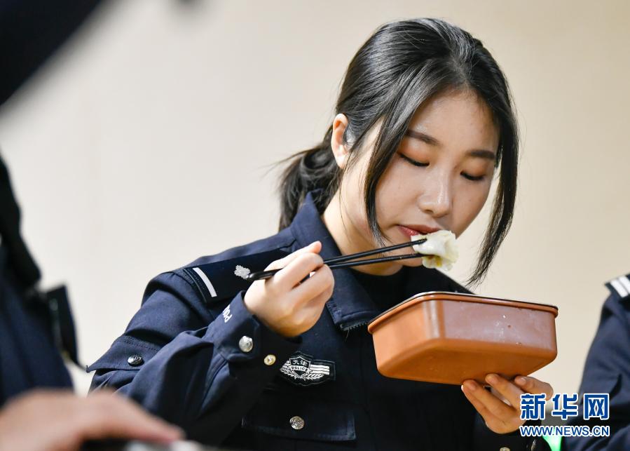 2月11日,在天津市紅橋區(qū)芥園派出所的餐廳,在崗位上過(guò)年的楊曉惠品嘗單位準(zhǔn)備的餃子。新華社發(fā)(孫凡越攝)