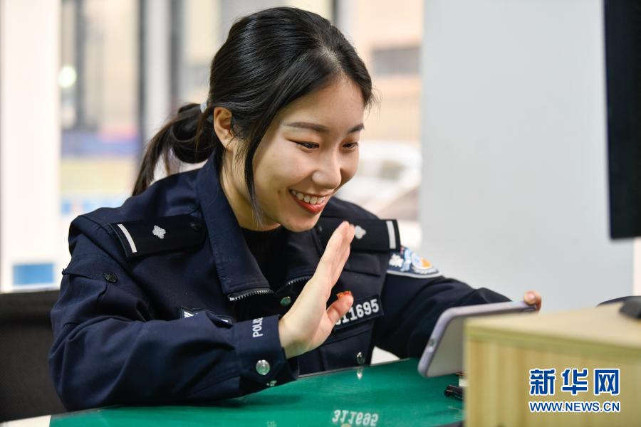 2月11日,在天津市紅橋區(qū)芥園派出所,楊曉惠與在河北邯鄲的爺爺奶奶視頻通話。新華社發(fā)(孫凡越攝)