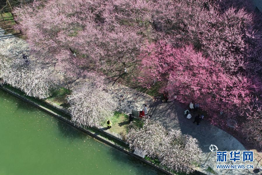 2月14日,在湖南省湘西土家族苗族自治州吉首大學(xué),市民在梅園里賞花(無人機照片)。新華社發(fā)(彭彪 攝)