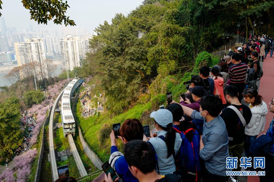 2月23日,在重慶軌道交通2號線佛圖關(guān)段,游客在山城步道上拍攝穿越花海的單軌列車。