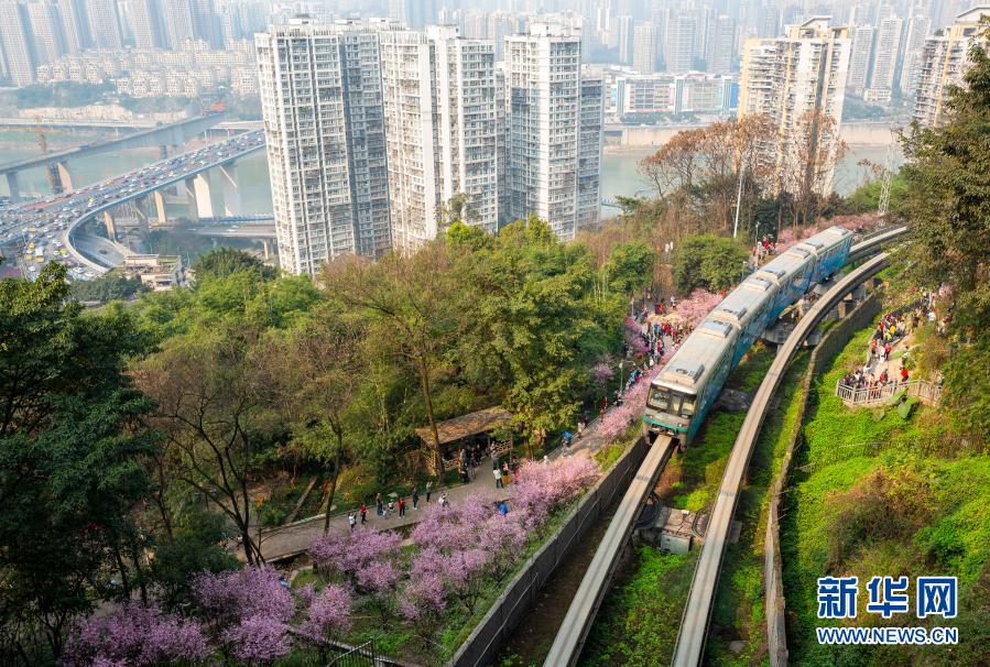2月23日,在重慶軌道交通2號線佛圖關段,一列單軌列車穿越花海奔馳而過。