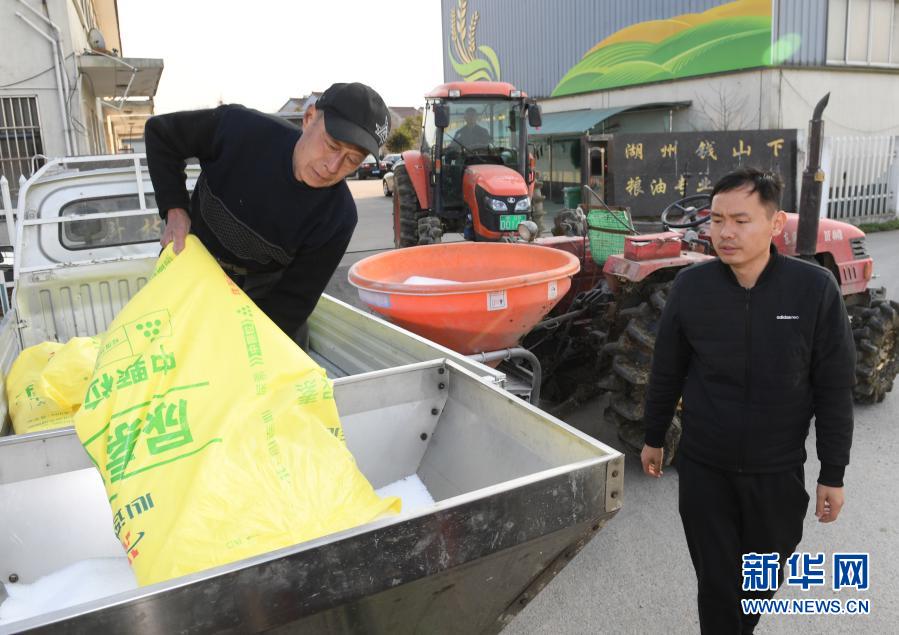 2月23日,湖州錢山下糧油專業(yè)合作社工作人員在農(nóng)機內(nèi)裝載化肥準(zhǔn)備施肥。立春過后氣溫回升,浙江省湖州市吳興區(qū)道場鄉(xiāng)全力開展春耕工作。今年該鄉(xiāng)計劃播種農(nóng)作物總面積1.2萬畝,其中水稻5000畝、小麥2000畝。新華社記者 翁忻旸 攝