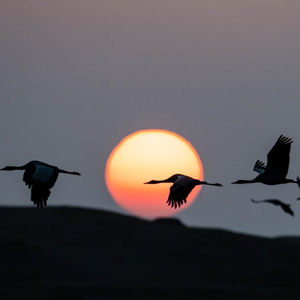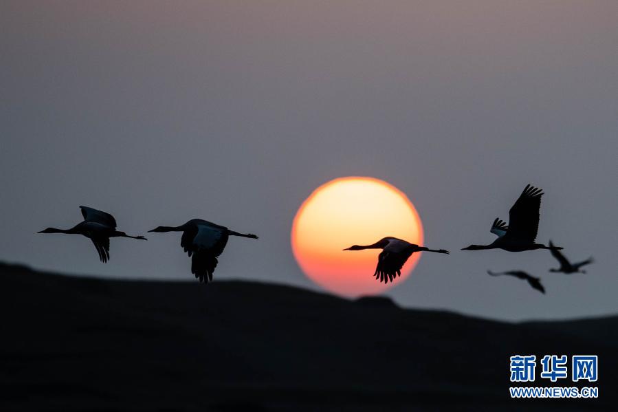 日出時分,黑頸鶴在大山包黑頸鶴國家級自然保護區(qū)飛翔(2月27日攝)。
