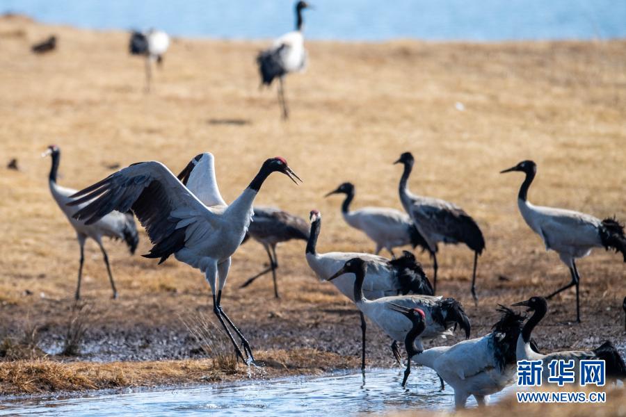 黑頸鶴在大山包大海子濕地嬉戲、覓食(2月26日攝)。新華社記者 胡超 攝
