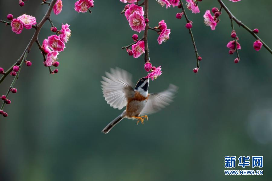 3月2日,在江蘇無(wú)錫管社山莊,小鳥在綻放的梅花下“親吻”花蕊。新華社發(fā)(潘正光 攝)