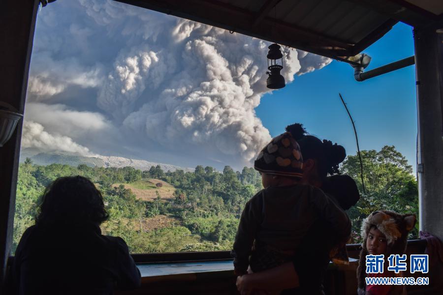 3月2日,人們?cè)谟《饶嵛鱽啽碧K門(mén)答臘省卡羅觀看噴發(fā)的錫納朋火山。新華社發(fā)(森比林?jǐn)z)