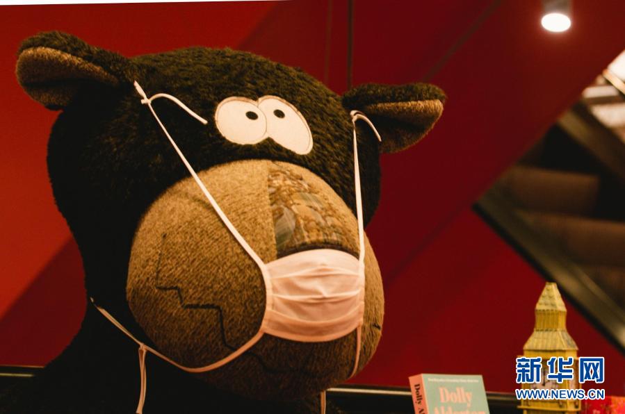 3月8日,德國科隆一家書店內(nèi)的毛絨玩偶“佩戴”口罩。