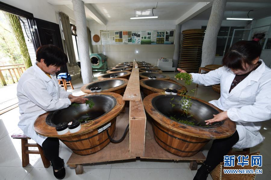 3月12日,在杭州市西湖風(fēng)景名勝區(qū)滿覺隴村的中國茶葉博物館滿覺隴炒茶中心內(nèi),茶農(nóng)在手工炒制西湖龍井茶。