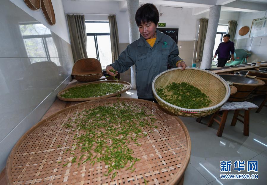 3月12日,在杭州市西湖風(fēng)景名勝區(qū)滿覺(jué)隴村的中國(guó)茶葉博物館滿覺(jué)隴炒茶中心內(nèi),茶農(nóng)把西湖龍井茶鮮葉進(jìn)行攤青。