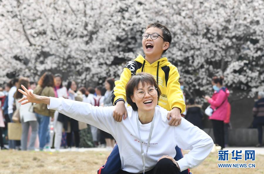 3月13日,廣東援鄂醫(yī)療隊成員梁仕鳳帶著孩子來到武漢大學(xué)賞櫻游玩。新華社記者 程敏 攝
