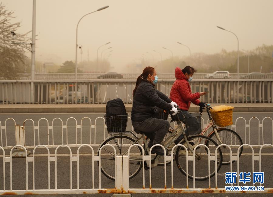 3月15日,市民騎車行駛在北京德勝門附近的道路上。當(dāng)日,我國(guó)北方多地出現(xiàn)沙塵天氣。新華社記者 賈浩成 攝