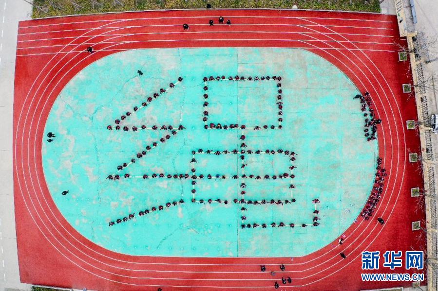 騎路小學(xué)的學(xué)生們在操場上排列站隊(duì)成“繩”字造型(3月9日攝,無人機(jī)照片)。新華社記者 李博 攝