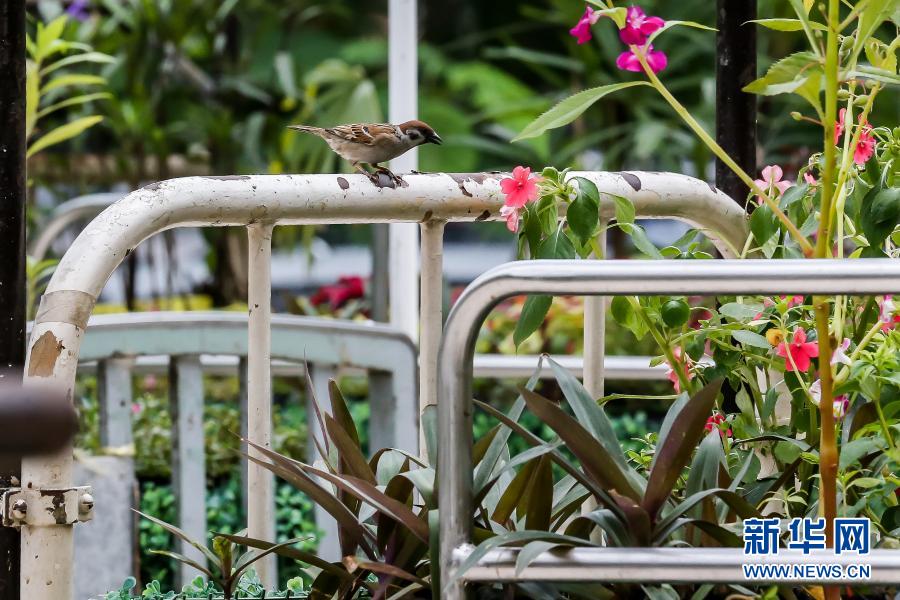 3月18日,在位于馬尼拉的菲律賓大學(xué)附屬菲律賓總醫(yī)院,一只麻雀站在“低語(yǔ)的花床”藝術(shù)裝置上。