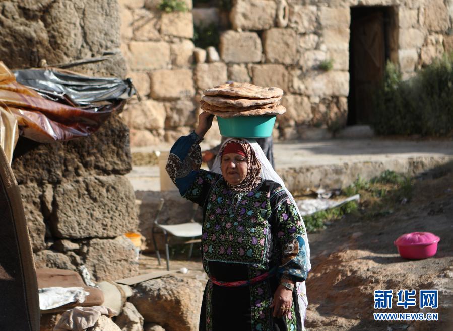 3月17日,70歲的卡茲蘭·阿布·卡巴什在約旦河西岸城市希伯倫附近的一個村莊運送制作好的“塔本”烤餅。