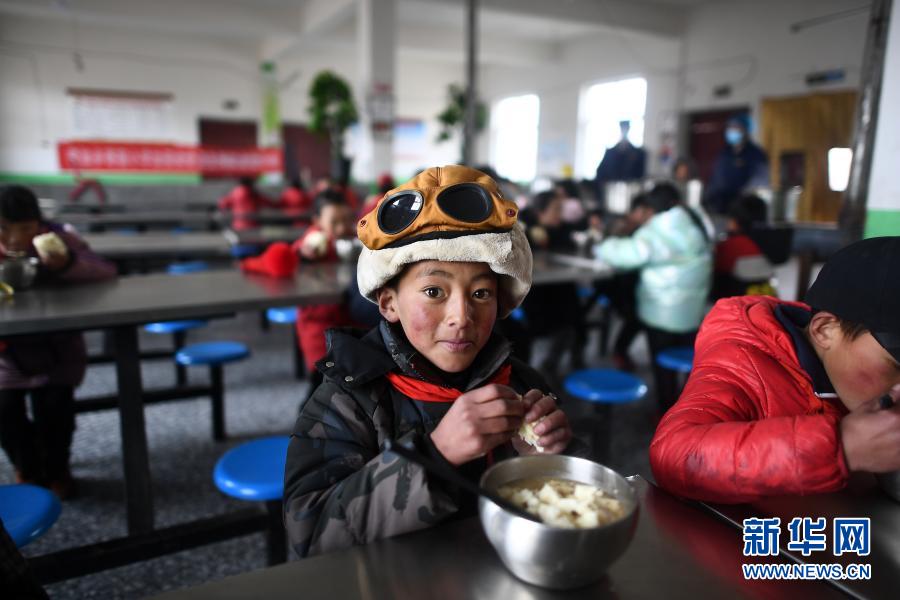 3月16日,在索加鄉(xiāng)寄宿小學(xué)食堂,格來達(dá)杰(前)在吃晚餐。新華社記者 韓方方 攝