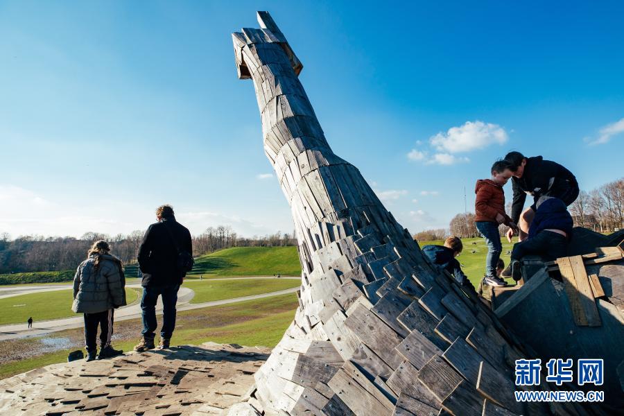 3月20日,人們在比利時(shí)博姆市的德舒爾森林公園和一座“巨人”雕塑“玩?!?。新華社記者 張鋮 攝