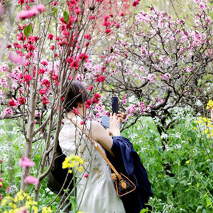 3月26日,“春暖浦東 十里桃花”2021上海桃花節(jié)開幕儀式在浦東南匯惠南鎮(zhèn)桃花村舉行,兩名當(dāng)?shù)仄炫蹍f(xié)會(huì)的姑娘在桃花村賞花。