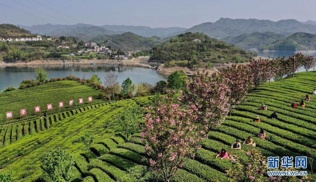 3月28日,流水鎮(zhèn)剛子茶葉專業(yè)合作社的社員在采摘新茶(無(wú)人機(jī)照片)。