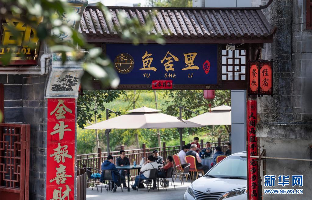 游人在流水鎮(zhèn)的古街上體驗(yàn)農(nóng)家樂(3月27日攝)。