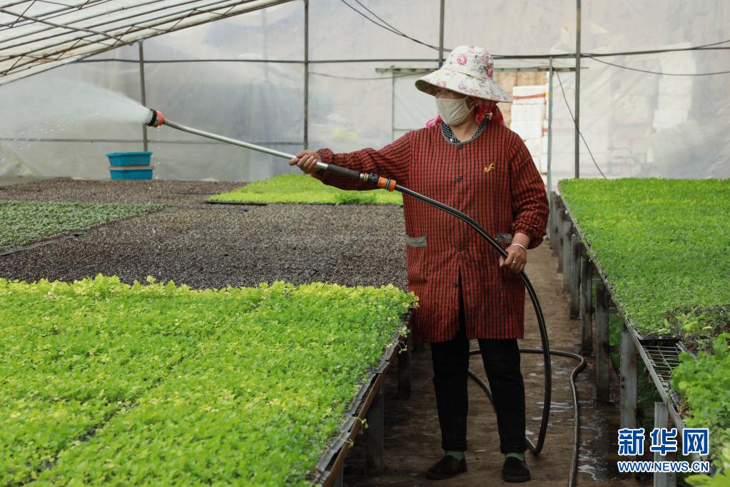 3月25日,位于青海省海西蒙古族藏族自治州都蘭縣香日德鎮(zhèn)下柴源村的都蘭柴源蔬菜種植專業(yè)合作社工作人員在澆灌蔬菜。新華社記者 王艷 攝