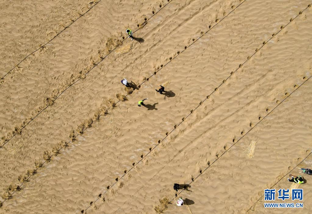 3月28日,人們在且末縣城不遠處的塔克拉瑪干沙漠內(nèi)植樹(無人機照片)。
