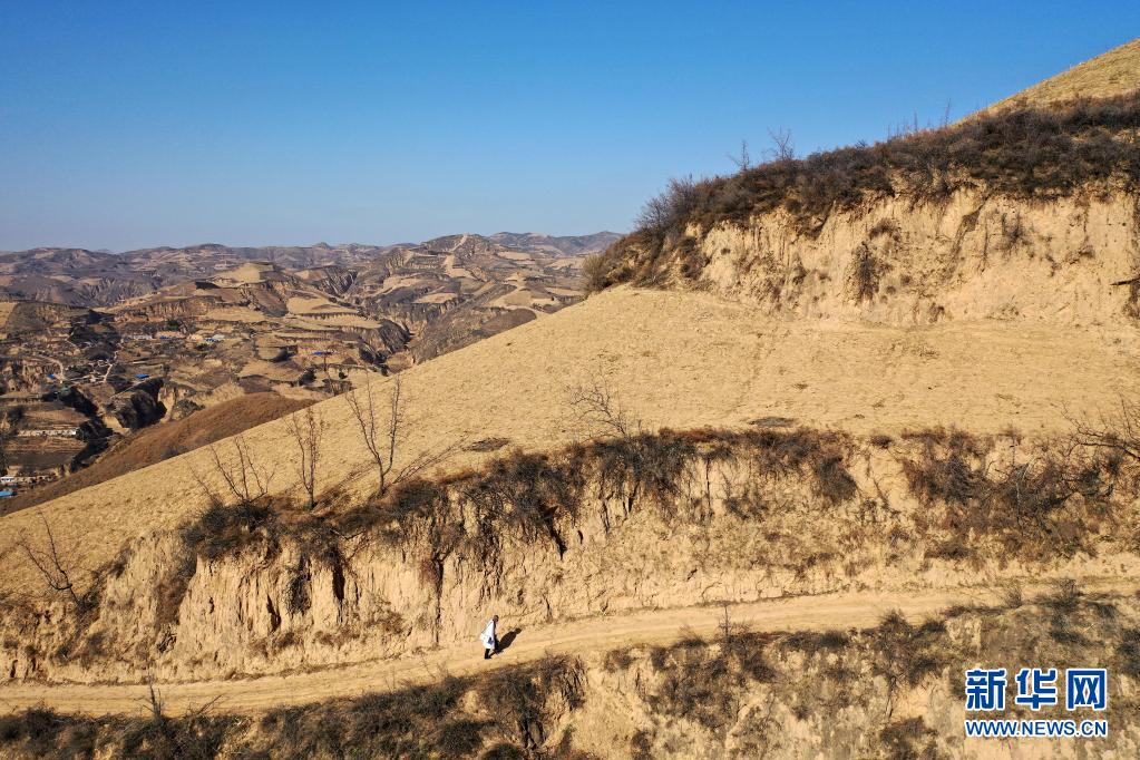 山西省石樓縣鐵頭村的村醫(yī)張尚保走在出診的山路上(3月23日攝,無人機(jī)照片)。新華社記者 詹彥 攝