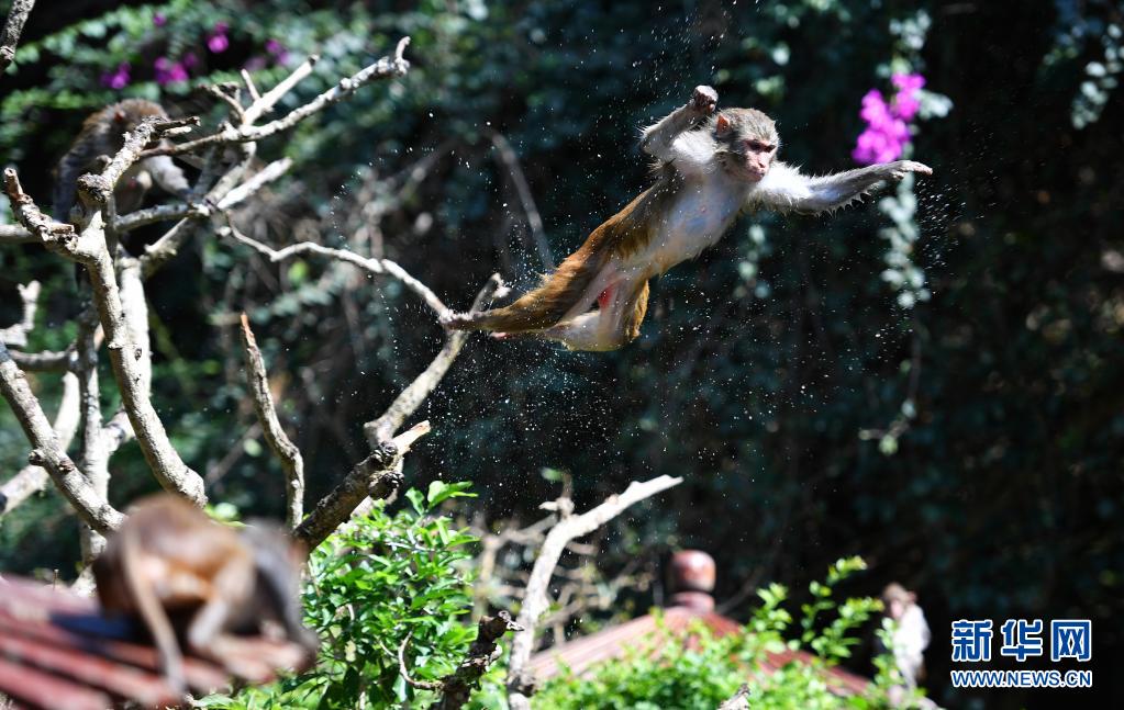 4月4日,獼猴在南灣猴島保護區(qū)里跳水。