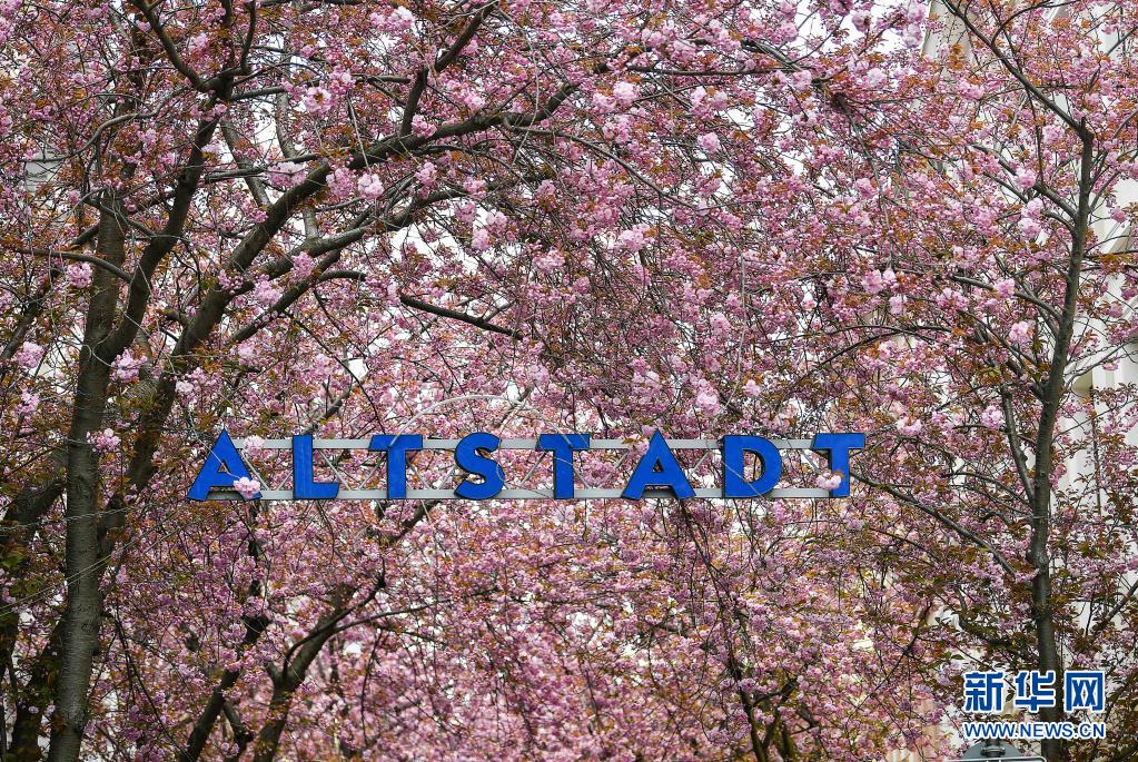 近日,德國西部城市波恩老城區(qū)的櫻花盛開,吸引了許多游人前來觀賞。
