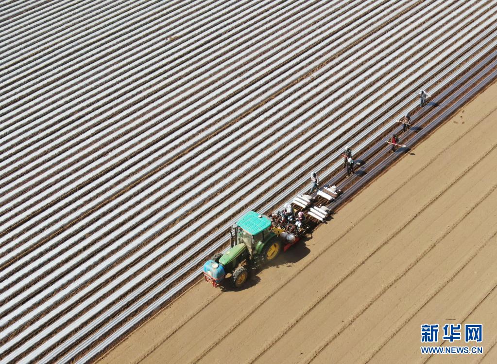 4月20日,工人操作機械設(shè)備在河北省張家口市塞北管理區(qū)農(nóng)業(yè)基地為剛播種的胡蘿卜覆膜(無人機照片)。