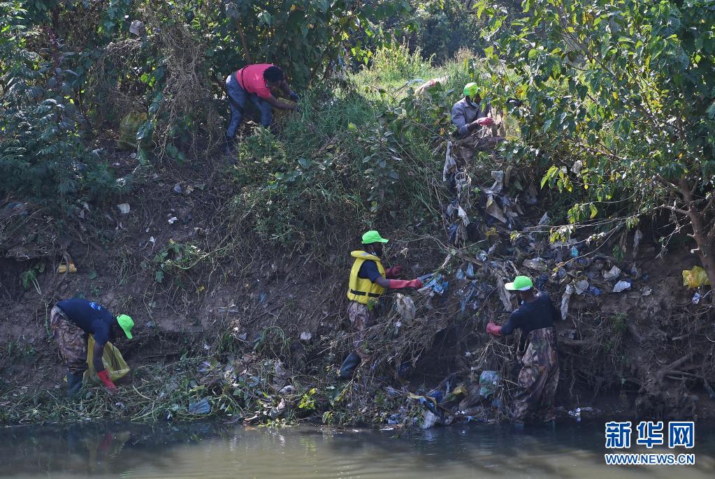 4月22日,南非比勒陀利亞的志愿者在河道邊清理垃圾。