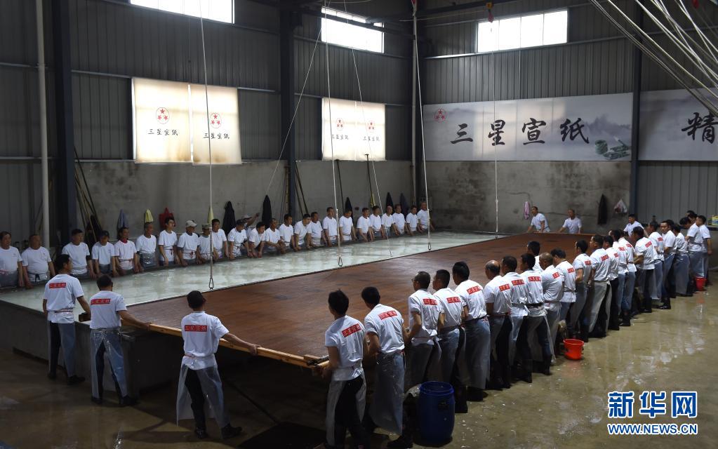 近日,在宣紙產(chǎn)地安徽省宣城市涇縣,“四丈宣紙”的抄制在一家紙業(yè)有限公司啟動(dòng)。50余名撈紙師傅操作巨型紙簾,齊心協(xié)力,在紙槽旁進(jìn)行撈紙作業(yè)。來(lái)回起落兩次,動(dòng)作整齊劃一。隨后工人們將紙簾吊起放至一邊揭下,一張巨大的宣紙便撈制成功。經(jīng)過(guò)曬、剪等工序后, 制成長(zhǎng)13.2米、寬3.6米的巨型宣紙就是“四丈宣紙”。