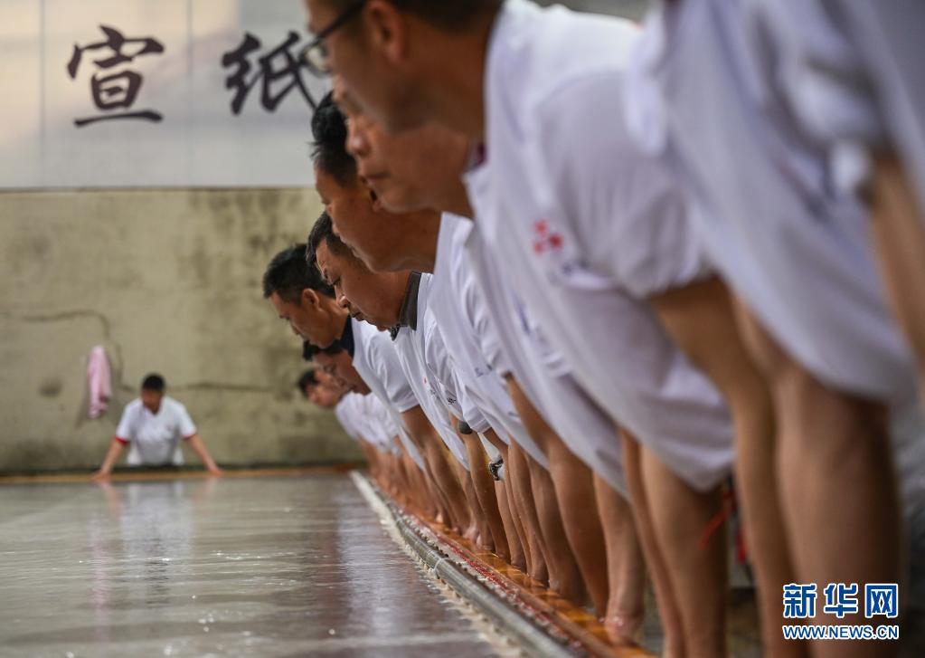 近日,在宣紙產(chǎn)地安徽省宣城市涇縣,“四丈宣紙”的抄制在一家紙業(yè)有限公司啟動(dòng)。50余名撈紙師傅操作巨型紙簾,齊心協(xié)力,在紙槽旁進(jìn)行撈紙作業(yè)。來(lái)回起落兩次,動(dòng)作整齊劃一。隨后工人們將紙簾吊起放至一邊揭下,一張巨大的宣紙便撈制成功。經(jīng)過(guò)曬、剪等工序后, 制成長(zhǎng)13.2米、寬3.6米的巨型宣紙就是“四丈宣紙”。
