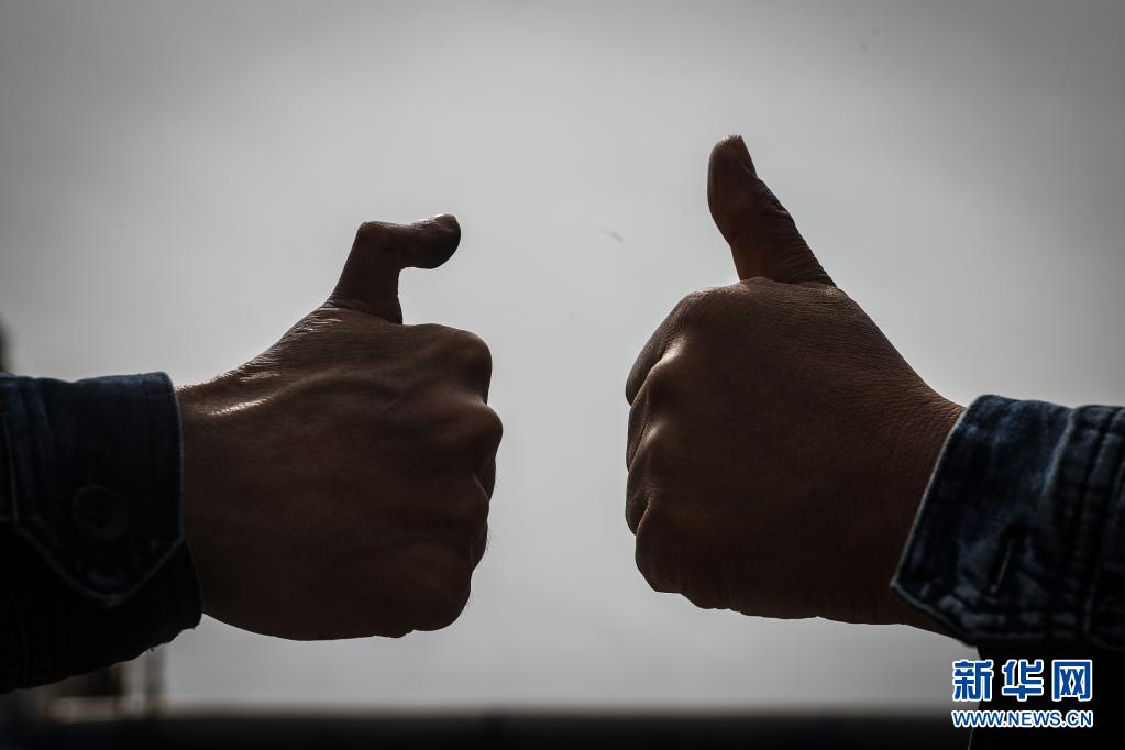 4月30日,王尚典(左)與同事一起做出“贊”的手勢(shì)。
