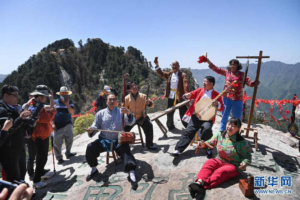 5月5日,華山景區(qū)西峰索道“華陰老腔團”在華山西峰之巔為游客表演。