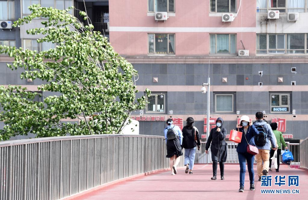 5月6日,市民在北京市海淀區(qū)一處天橋上頂風(fēng)行走。